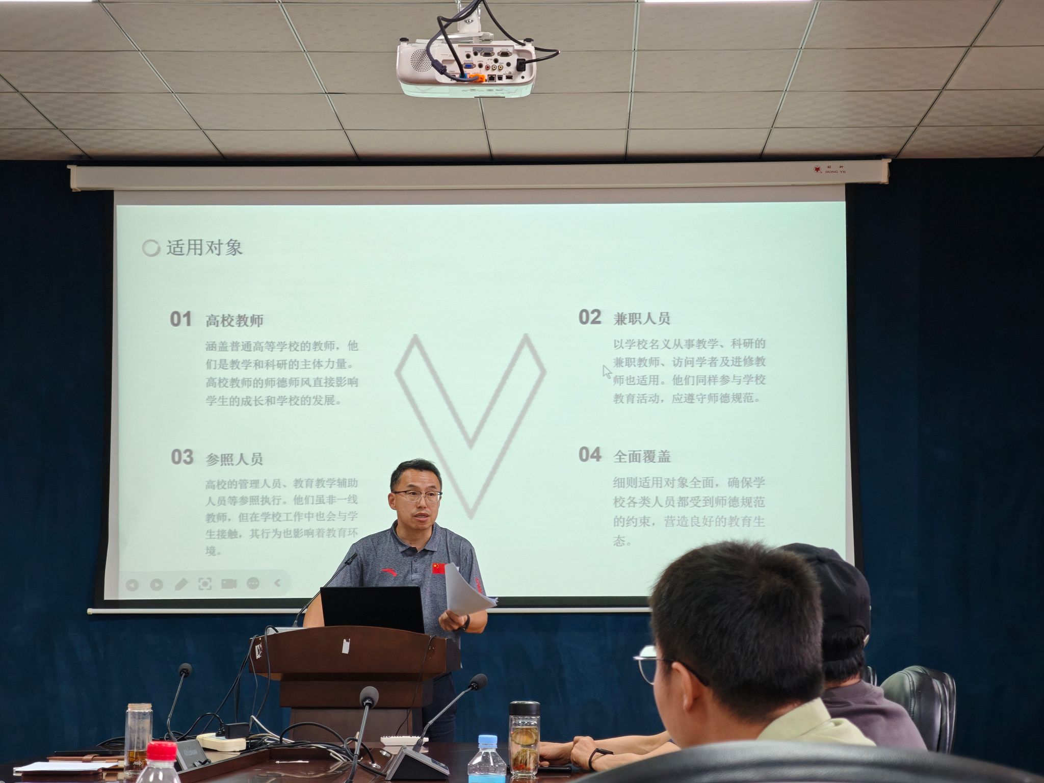 学院党委书记胡亚会以“贯彻八项规定精神,推动学院高质量发展”为题和老师们共同对中央八项规定精神进行了新学期的又一次学习。胡书记随后向老师们详细解读了《四川省高等学校教师师德失范行为处理实施细则》,从失范行为,处理方式,处理程序,监督问责几个方面作了说明,9月是学校师德师风建设主题月,学院一直强调师德师风建设,始终把该项工作作为教师职业规范首要任务。
