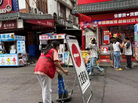 在张公桥美食街,志愿者们用行动绘就了一道别样的风景。他们化身秩序引导员,耐心劝导前来的车辆与摊贩,守护街区通畅,只为让每一位行人都能安心徜徉;他们更化身贴心服务员,面对络绎不绝的游客,不仅热情指引路线、解答咨询,更设立了便民服务点,并贴心提供物品寄存服务。志愿者们春风化雨般的解答与笑容,让天南地北的游客沉浸式地体验了乐山的温度与青春的活力。