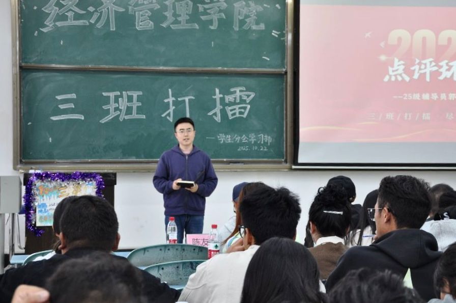 本网讯(文丨李馨怡、宋含艺,图|海来妹妹、俄色拉姆、布各小合木)10月22日下午,经济管理学院于行知楼401室开展2025级“三班打擂”比赛。本次比赛评委由经管学院学工办主任王东健,辅导员陈聪、张金秋、郭旭老师,辅导员助理李霖燚及团学干部担任,25级代班及参赛学生们共同参与此次活动。