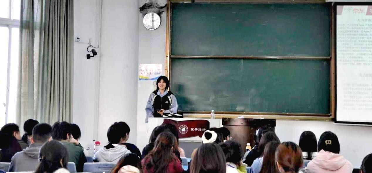 首先,蒲钦对实训月工作情况进行总结。他对同学们在实训期间的付出与支持表示感谢,并肯定了同学们在实践中展现的学习热情与专业素养。随后,人力资源一班龚利、文静、王晓云、周会羽同学作为学员代表分享实训心得。他们表示,京东实训不仅搭建了理论结合实际的实战平台,更让大家在实践中学会了情绪管理、客户需求挖掘、产品知识运用与复杂问题拆解,收获了课本之外的宝贵经验。