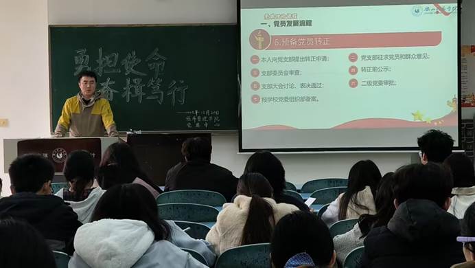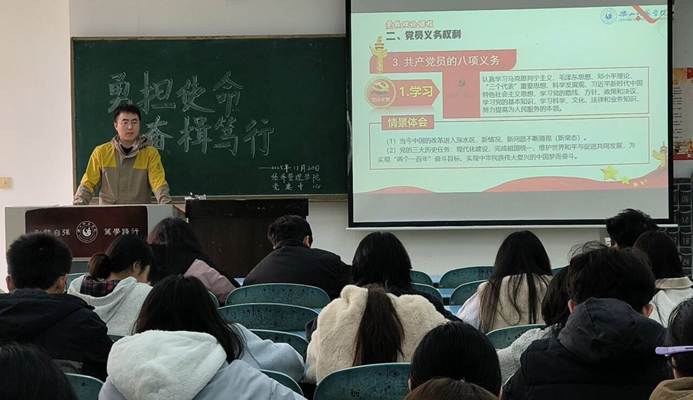 本网讯(图、文/彭景)11月20日,经济管理学院分党校在行知楼312教室顺利开展“勇担使命,奋楫笃行”入党积极分子专题培训。本次培训由学院第一学生党支部书记郭旭主讲,第五十二期全体入党积极分子全体参与,为学员们筑牢思想根基、明晰入党路径搭建了重要平台。