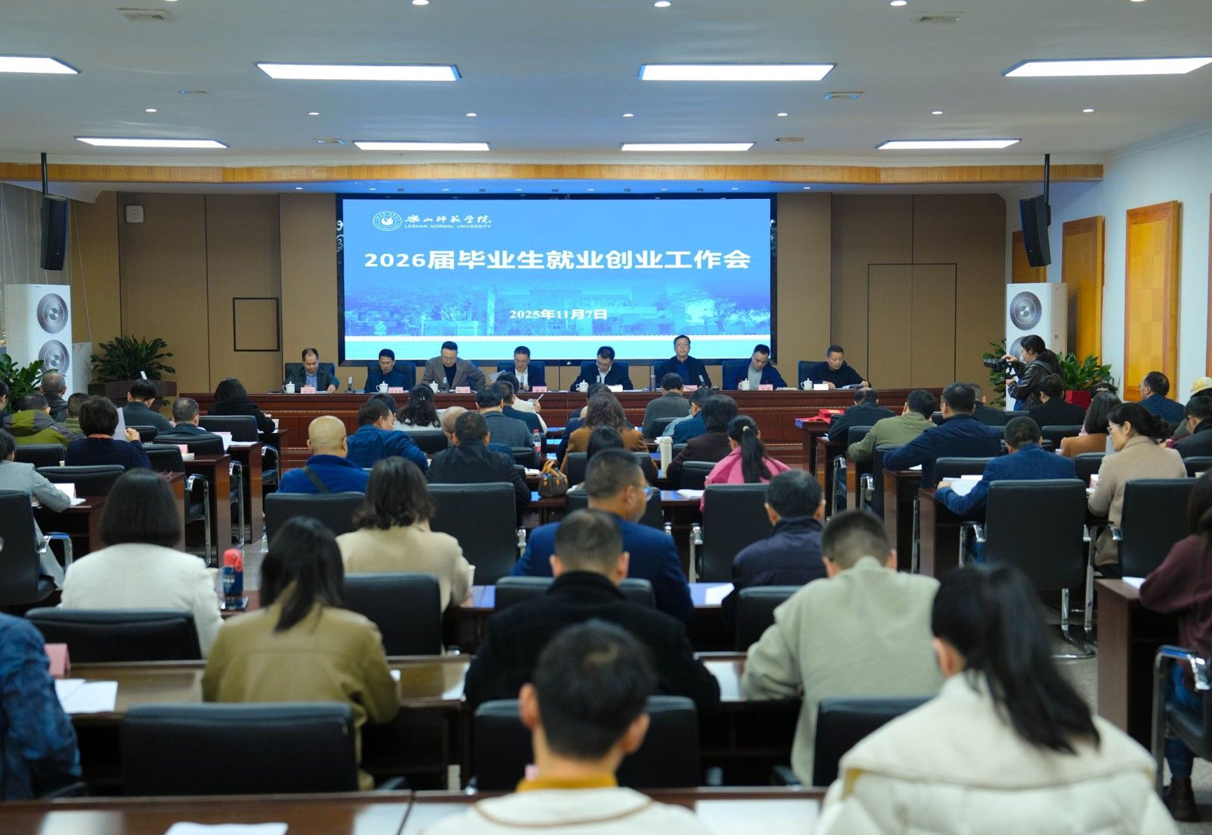 本网讯(文/蒋慧琴、吴钰涵,图/杨爽、陈聪)在11月7日乐山师范学院召开的2026届毕业生就业创业工作会上,经济管理学院凭借2025届毕业生就业工作的优异表现,被授予“2025届毕业生就业工作先进集体”称号,校领导为学院颁发荣誉证书。