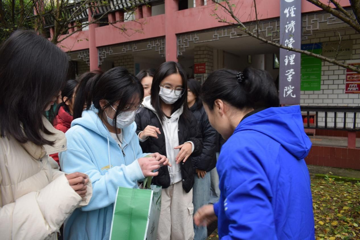 慰问现场,丁敏娜代表学院发表讲话。她肯定考研学子们长期以来的付出,同时针对备考冲刺阶段普遍存在的焦虑和压力,对大家进行疏导和鼓励,鼓励同学们坚定信心、科学规划复习,合理调整身心状态,以从容心态和最佳状态迎接考试挑战。随后,学院领导和老师们为考研学子逐一送上学院精心准备的暖冬慰问品,并详细询问大家的备考进度、生活需求及遇到的困难,给与鼓励与关心。这份礼物不仅承载着学院对考研学子的物质关怀,更给予了他们精神上的鼓舞。